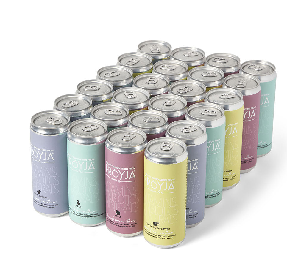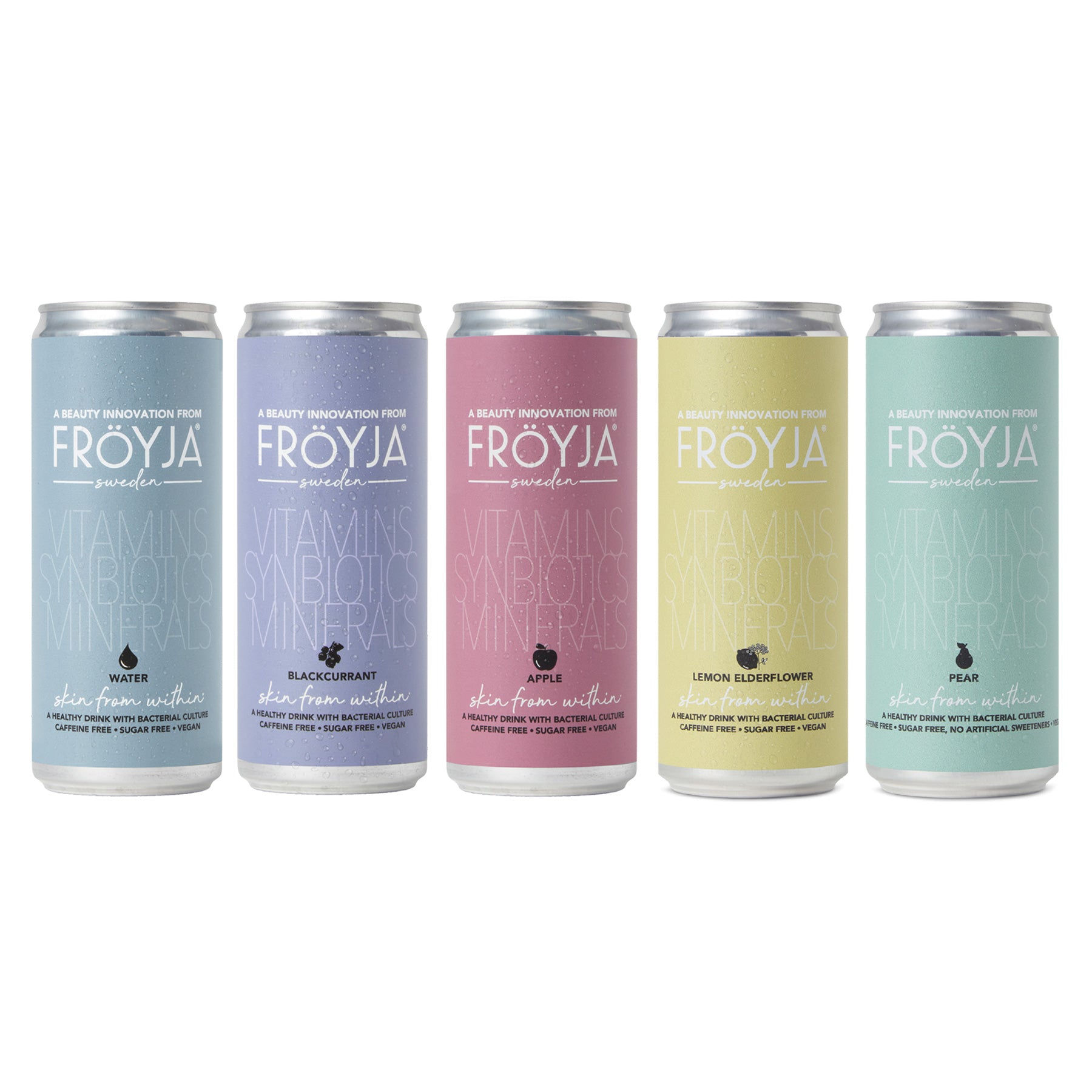 Fröyja Mix 24-pack innehåller just nu 6 burkar Svarta Vinbär, 6 burkar Äpple, 6 burkar Citron Fläder och 6 burkar Päron