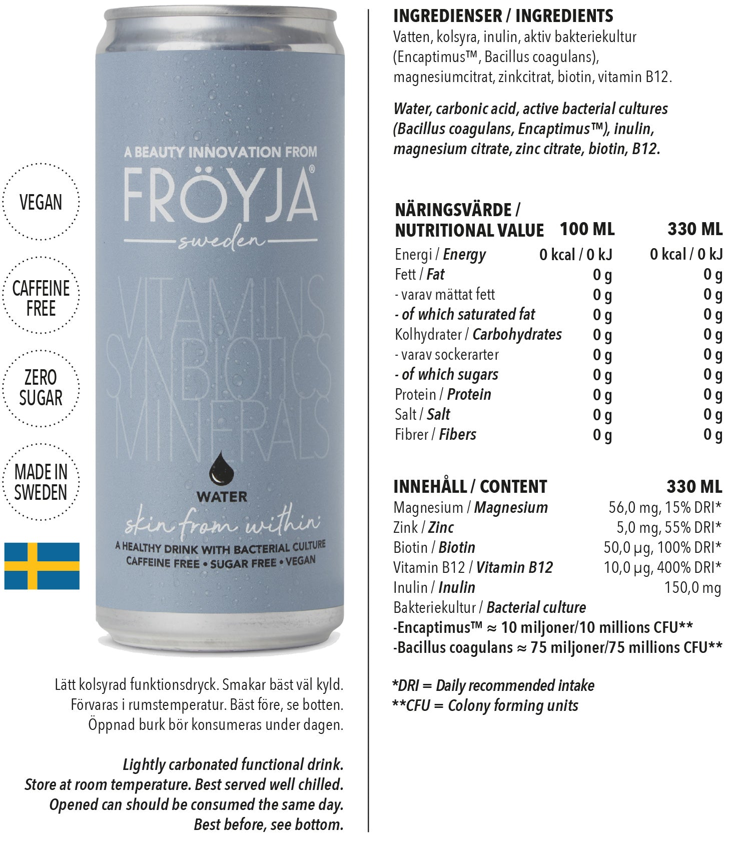 Fröyja är en lätt kolsyrad koffeinfri dryck, koffein hämmar vår absorption av viktiga vitaminer och mineraler. Därför kan den konsumeras av alla när som helst, inklusive ammande mödrar, gravida kvinnor och barn.